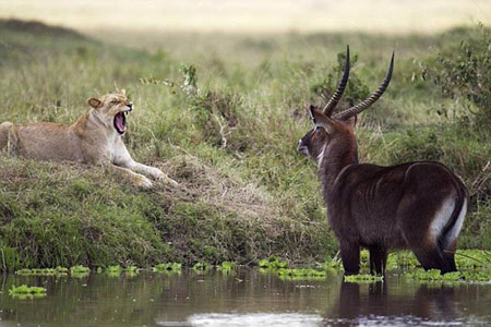 Kenya'daki Masai Mara Ulusal Parkı'nda çekilen görüntüler, sabrın dişi aslanın işine bu kez pek yaramadığını gösterdi. Göletin içerisine girip, su içen antilobu farkeden dişi aslan, hayvanın birkaç metre yakınına gidip, sudan çıkmasını beklemeye başladı. Uzun bekleyiş sonrasında, antilop sudan çıkar çıkmaz saldıran aslan, beklemediği bir karşı saldırıya uğradı.