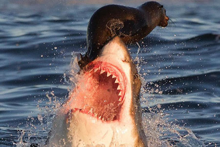 Fotoğraf Güney Afrika açıklarında bulunan False Bay Seal Adası yakınlarında çekildi... Güney Afrika'nın köpekbalığı kaynayan sahillerinde tekneyle gezen turistler inanılmaz bir ana şahit oldu. Denizin içinden aniden çıkan dev köpek balığının fok balığına saldırış anı böyle görüntülendi.