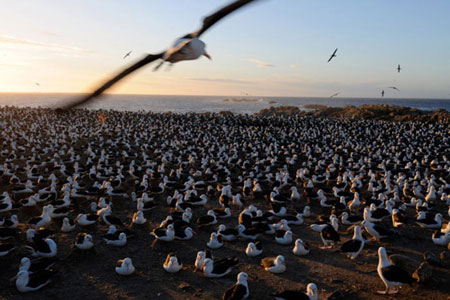 Siyah tepeli albatros 8 ayak kanat genişliğiyle, çiftleşmek için Falkland Adaları'nda süzülüyor. Büyük Göçler'den.