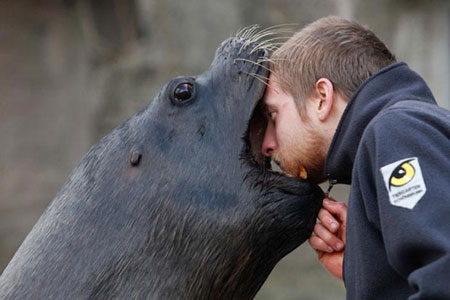 Avusturya’nın başkenti Viyana’da bulunan Schöenbrunn Hayvanat Bahçesi’nde yaşayan deniz aslanı ve bakıcısının görüntüleri ziyaretçileri şaşırttı. Güney Amerika kökenli deniz aslanı, bakıcısının kafasını ağzının içerisine sokmasına izin verdi. Deniz aslanı daha sonra bakıcısının havaya fırlattığı balığı büyük bir ustalıkla kaptı. 1752 yılında kurulan Schöenbrunn dünyanın en eski hayvanat bahçesi olma unvanını taşıyor.