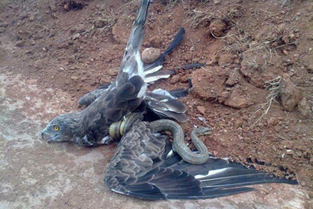 internette dolaşan bu karede doğada nadir görülen olaylardan biri gerçekleşmiş. Bir yılanı avlamak isteyen şahin avcıyken av durumuna düşmüş. Şahini kanadından yakalayan yılan, etkisiz hale getirdiği avcının ölmesini bekliyor...