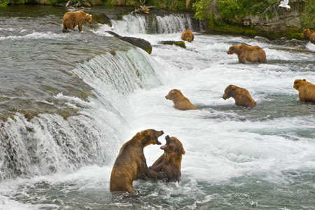 Ayıların Somon avı Alaska'nın Katmai Ulusal Parkı'nda her yıl geleneksel olarak somon avına çıkan boz ayılar, ilginç görüntüler oluşturdu. Boz ayıların açık denizlerden Alaska sularına dönen milyonlarca somon balığı için girdikleri mücadele fotoğrafçı Ami Vitale tarafından böyle görüntülendi.Avlanma yöntemleri birbirinden farklı olan ayılar ,bazen şelaleden düşen somonları havada yakalıyor, bazen de sığ sularda dolaşarak ya da diğer ayıların elinden kaparak karınlarını doyuruyor.