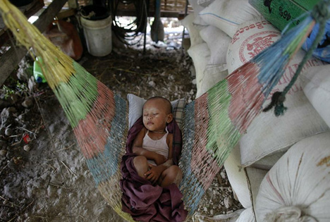 Pirinç çuvallarının arasına kurulan hamakta uyuyan çocuk objektife böyle yansıdı.
