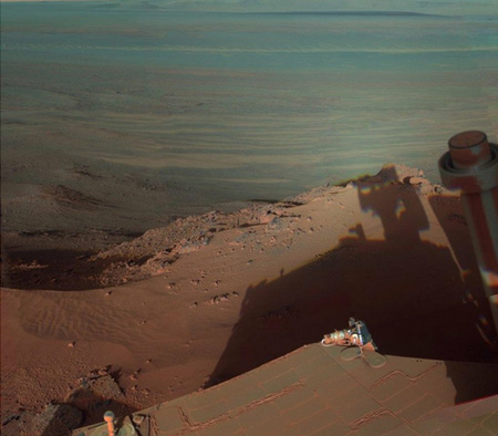 NASA’nın Mars keşif robotu Oppurtunity, Kızıl Gezegen’deki dev Endeavour kraterine bakan bir noktada mükemmel bir kare yakaladı.