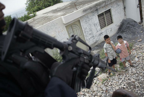 Meksika'da polisiye filmlerini aratmayan görüntülerle devreye gezen polis ve oyunlarına ara vererek polise dikkat kesilen iki çocuk, 'namlunun ucunda' objektife böyle yansıdı.