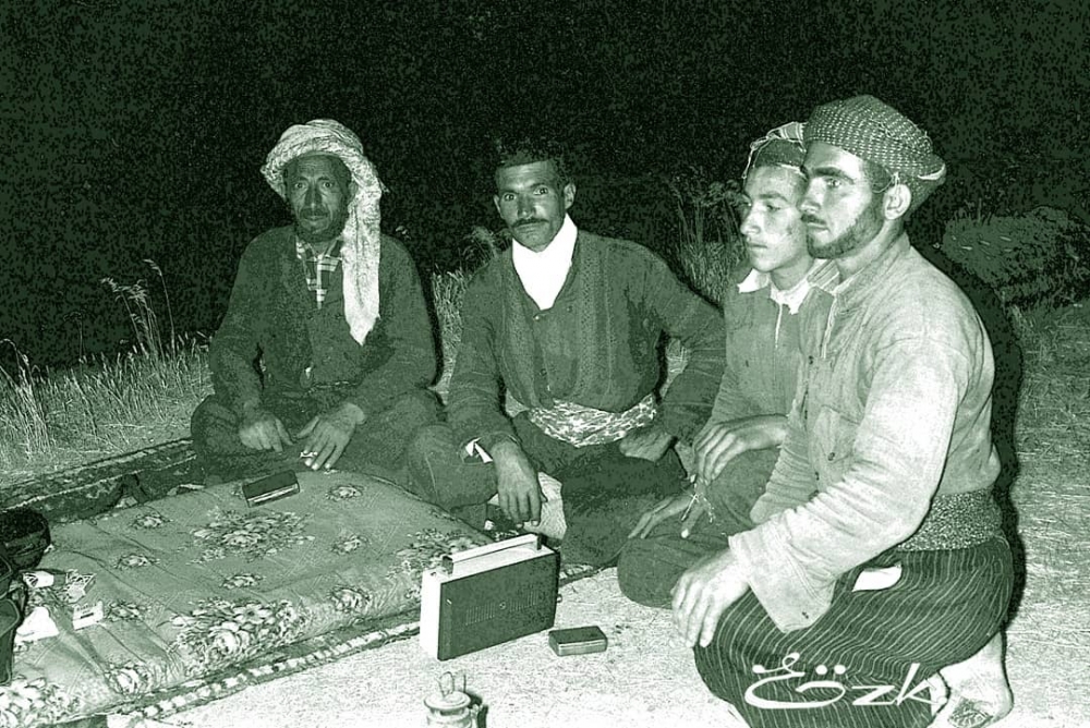 Şemdinli, Salaran köyünde muhtar Faris ve köylüler. Kürtçe müziğin yasak olduğu yıllarda bir akşam Bağdat radyosundan pür dikkat -Goranî Dawakirawa- istekler programında Kürtçe müzik dinliyorlar. 1970'li yıllar.