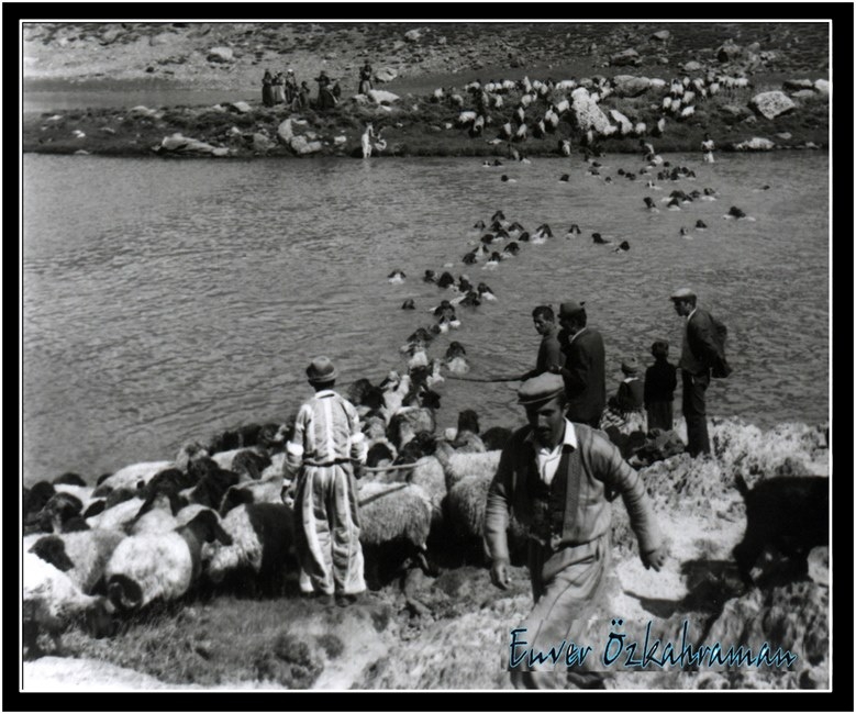 Sat göllerinde koyun kırpmadan önce yıkanan koyunlar.