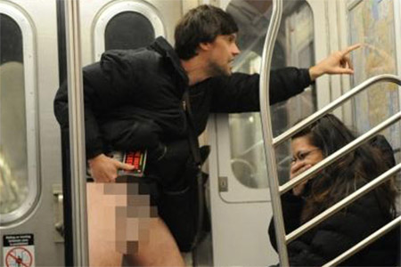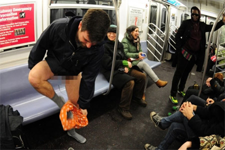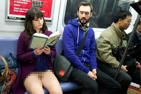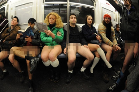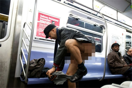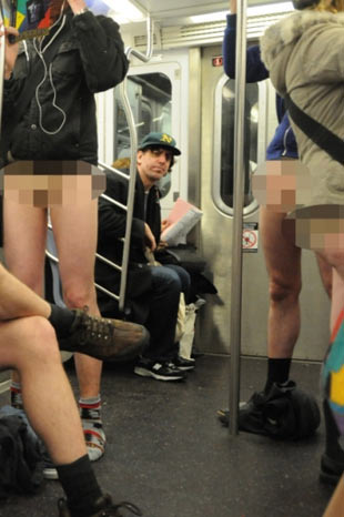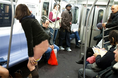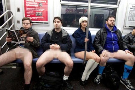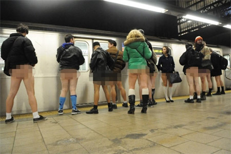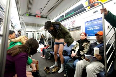 ABD’nin New York kentinde dokuz yıldır ‘Metroda Pantolonsuz Yolculuk’ eylemi düzenleyen “Improve Everywhere” adli grup, eylemlerini bir adim daha ileri taşıdı.Önceki gün değişik istasyonlarından New York metrosuna binen kadınlı erkekli 1000 kişi, bu kez iç çamaşırlarını da çıkardı. Yolcular, kendileriyle aynı vagonları paylaşan ve bir anda yari çıplak kalan “çılgın yolcuları” şaşkın bakışlarla izledi.