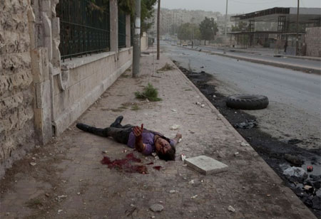 Jerome Sessini: "19 yaşındaki bu genç caddeye çıktıktan kısa bir süre sonra keskin bir nişancı tarafından boğazından vurularak öldürüldü. Bu fotoğraf, savaşın acımasız gerçekliğini bir kez daha bana hatırlattı." (Jerome Sessini/20 Ekim 2012)