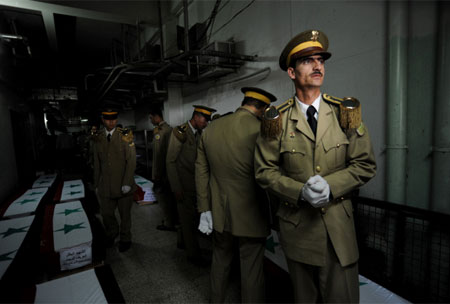 Kate Brooks: "Suriye'nin başkenti Şam'a gittikten birkaç gün sonra askerler için düzenlenen cenaze törenlerinin fotoğraflarını çektim. Tişren Askeri Hastanesi'nde 8 askerin cenazesi morgda tören sırasını bekliyordu. Fotoğrafları çektiğimde, cenazelerin başında bekleyen beyaz eldivenli askerlerin ne düşündüğünü bilmiyorum. Ancak tüm Suriyeliler gibi geleceklerinden endişeli olmalıydılar. Haziran ayında Suriye'de bulunduğum sırada haftada 100'e yakın asker ve subayın çatışmalarda öldürüldüğü belirtiliyordu. Ülkedeki iç savaşa rağmen, bütün askerlerin askeri törenle defnedilmesine özen gösteriliyordu." (Kate Brooks/ 23 Haziran 2012)