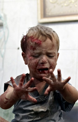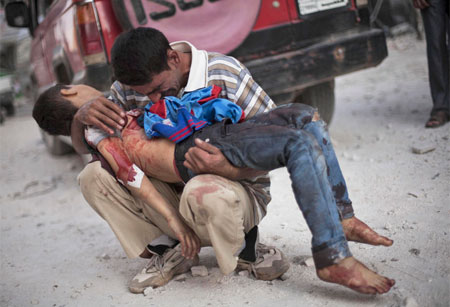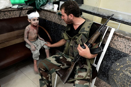 Aris Messinis: "Özgür Suriye Ordusu üyesi bir isyancı, bir helikopter saldırısında evi vurulan bir çocuğu teskin etmeye çalışıyor. Saldırı sonrası çocuk, komşuları tarafından hastaneye getirildi. Tedavisinin ardından resepsiyon kısmına alındı. Saldırı sonrası birçok çocuk ağır yaralı hastaneye getirildiği için, o ayakta tedavi edildi. Ailesi gelip, çocuğu alana kadar, bu günahsız çocuğa Özgür Suriye Ordusu üyesi isyancı refakat edecek." (Aris Messinis/ 24 Ağustos 2012)