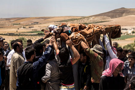 Marcel Mettelsiefen: "Dokuz gün kuşatma altında kalan Rastan'dan kaçmayı başarmıştık. İyi organize olmuş isyancılar bizi güvenli bir evden başka güvenli bir eve götürüyordu. Çatışmalarda ağır yaralanmış isyancı Ubeyd Dariş Laban'la birlikte bir araca bindirildik ve hızla Türkiye sınırına doğru ilerliyorduk. 40 kilometrelik bir yolculuğun ardından isyancı Laban, araçta yaşamını yitirdi. Laban için Rastan'a yakın köyünde cenaze töreni düzenlendi. Cenaze töreni sürerken üzerimizde askeri helikopterler uçuyordu. Bu Suriye'de çektiğim son rahatsız edici fotoğraf oldu." (Marcel Mettelsiefen/ 17 Temmuz 2012)