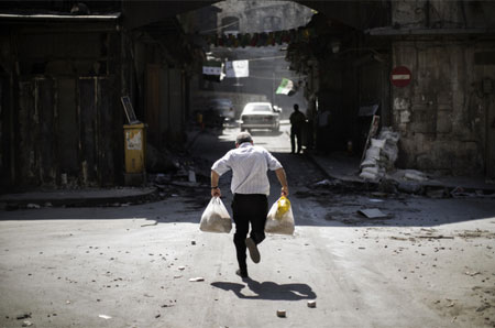 Marco Longari: "Halep'e ulaştıktan kısa bir süre sonra antik kentte bir kontrol noktasında bu fotoğrafı çektim. Bu adamı panik içinde koşarken gördüğümde öğle vaktiydi. Özgür Suriye Ordusu'na ait bir kontrol noktasından geçti. Caddeyi geçmeye çalışan herkese silahların namluları çevriliydi. Ailesinin günlük ihtiyaçlarını karşılamaya çalışan bir öğretmen olduğunu söyledi. Onu gördüğümde Saraybosna'da yaşananlar aklıma geldi. Ekmek için kuyruğa girenler, Sırp keskin nişancılar tarafından koyun gibi öldürülüyorlardı." (Marco Longari/14 Eylül 2012)