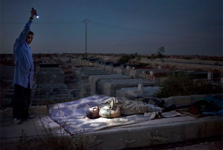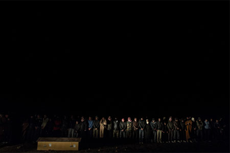 Remi Ochlik: Boyada köyü sakinleri gecenin 03.00'ünde, Esad birliklerinin saldırısında öldürülen 4 gencin cenaze töreninde. Ordunun saldırmasının önüne geçmek için halk, genelikle cenazeleri gece defnediyor. Suriye'de Marie Colvin'in öldürüldüğü saldırıda hayatını kaybeden Remi Ochlik'in çektiği son fotoğraf. Ochlik, aynı tabutta gömülen 4 genci bu fotoğrafla ölümsüzleştirdikten 4-5 saat sonra saldırıda yaşamını yitirdi. Ochlik'in ise bir tabutu dahi olmadı. Öldürüldüğünde Humus'taki şiddetli çatışmalar nedeniyle günlerce cesedine dahi ulaşılamadı. (Remi Ochlik/IP3/21 Şubat 2012)