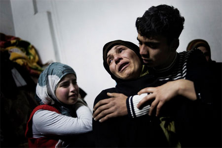 Alessio Romenzi: "Humus'da Suriye ordusunun roket saldırısında iki oğlu ölen anne, geride kalan çocuklarıyla birlikte gözyaşı döküyor. Suriye'de çatışmalarda yaşamını yitirenlerin yüzde 90'ı masum siviller. Bu fotoğraf tipik bir örnek. Suçsuz ve günahsız insanların öldüğünü gördüğünüzde, bunun ne kadar kötü olduğunu daha iyi anlıyorsunuz. Suriye halkının tek şansı biz gazetecileriz. Seslerini duyurmak için mümkün olduğunca gürültü yapmaya çalışıyoruz."