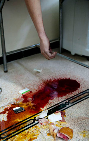 Paul Conroy: "Bu fotoğrafı, Marie Colvin ile Humus'un Bab Amr mahallesinde geçirdiğimiz ilk gün çektim. Sahra hastanesine yaptığımız yolculukta bile çok büyük tehlike atlatmıştık. Her tarafta keskin nişancılar vardı ve roketler patlıyordu. Durduğumuz bir anda, sürücümüz gülmeye başladı ve kendisini takip etmemizi söyledikten sonra kurşun gibi koşmaya başladı. Biz de koşarak onu takip ettiğimizde, etrafımızda roketler patlamaya ve kurşunlar duvarlara saplanmaya başladı. Sahra hastanesine girdik, dışarıya göre daha sakindi. 10 dakika sonra çığlıklar atıldı ve çatışma başladı ancak hastanede panik havası yoktu, bu durum onlar için sıradandı. Yaralıları tedavi ediyor, ölüleri yıkıyor ve her şey kendini tekrarlıyordu. Çaresiz bir andı." (Sunday Times muhabiri Marie Colvin ve Remi Ochlik'in öldürüldüğü saldırıda Paul Conroy da yaralandı. Bu saldırıda Edith Bouvier de ağır yaralandı.) (Paul Conroy/ 18 Şubat 2012)