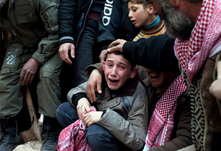 Rodrigo Abd: "İdlib'de Özgür Suriye Ordusu'nun kontrolü altındaki bir bölgedeydik. Cenaze töreninde bile durumun her geçen dakika daha kötüye gittiğini görüyorduk. İnsanlar öldürülen akrabaları için yas tutuyorlardı ama aynı zamanda bir sonraki hedefin de kendileri olacağı endişesini yaşıyorlardı. İsyancılar, Suriye ordusunun geleceğini ve karşı koyacak silahlarının olmadığının bilincindeydi. "Nereye gidiyorsunuz? Bir kaçma planımız var mı?" diye sorduğumda şu cevabı vermişlerdi: "Gidecek bir yerimiz yok. Burada yaşıyoruz, burada doğduk ve ölene kadar da buradan ayrılmayacağız. Biz gazeteciyiz, haber yapmak zorunda olduğumuzun farkındayız ama aynı zamanda buradan kaçıp kurtulma şansımız olduğunu da biliyoruz. Oradaki köylüleri görmelisiniz. Çatışmanın ortasında sıkışıp kalmışlar. Ya Suriyeli askerleri öldürecekler ya da ölecekler. Biz elimizden geleni yapmaya çalıştık ama Suriye halkı hala acı çekmeye devam ediyor." (Rodrio Abd/AP/ 8 Mart 2012)