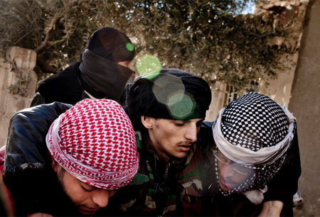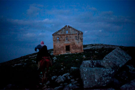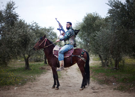 Giorgos Moutafis: "El Şatura köyüne vardıktan kısa bir süre sonra zeytin ağaçlarının arasında Özgür Suriye Ordusu mensuplarıyla buluştum. On kişiydiler ancak sadece üçü silahlıydı. Daha iyi organize olmak ve eğitim almak için Türkiye sınırına yakın bölgedeki dağlara çıkacaklarını söylediler. Üzerlerindeki psikolojik baskıyı ve yaşadıkları hayal kırıklığını hissediyordum. Aniden onlardan birinin atına binip, silahıyla, onurlu bir şekilde poz verdiğini gördüm." (Giorgos Moutafis/ 16 Mart 2012)