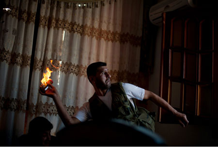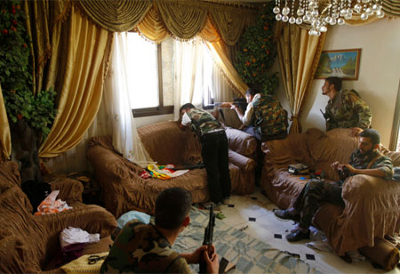 Goran Tomasevic: "Bir evin oturma odasında cephe alan isyancıların bulunduğu bu fotoğrafı seviyorum. Bir isyancı koltuğa oturmuş, çikolata yerken, komutanları pencerede mevzi almış. Bu evin Suriyeli askerlerin mevzilendiği bir yer olduğunu bana söylediler. Üç asker öldürerek evi ele geçirmişler. Koridorda kan izleri vardı. Evde isyancılardan başka kimse yoktu." (Goran Tomasevic/Reuters/ 15 Ağustos 2012)