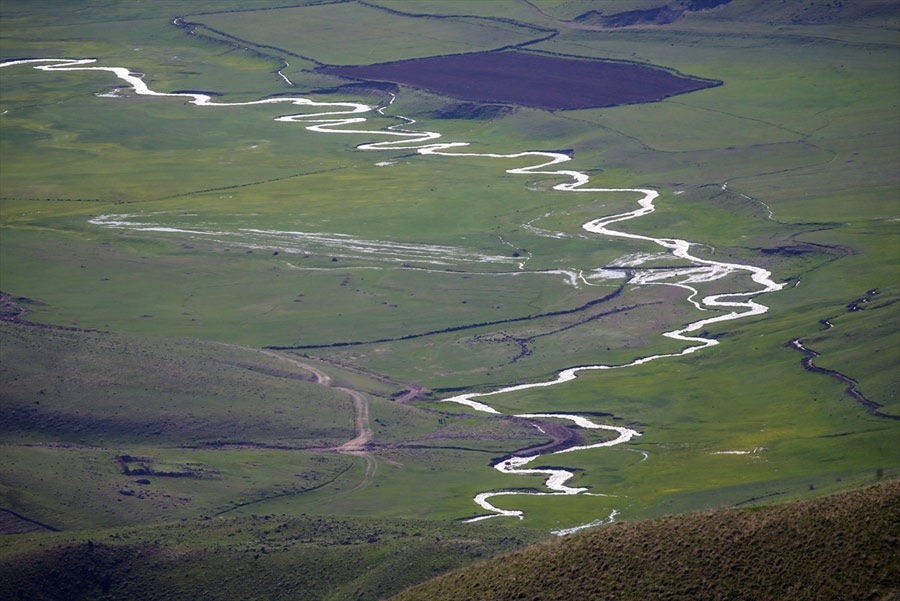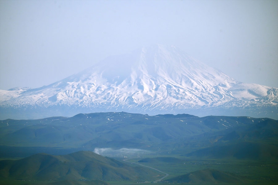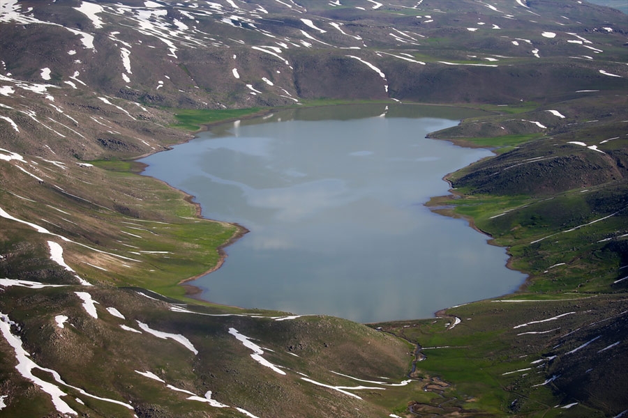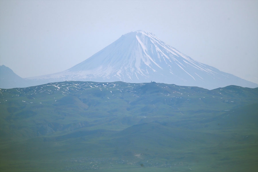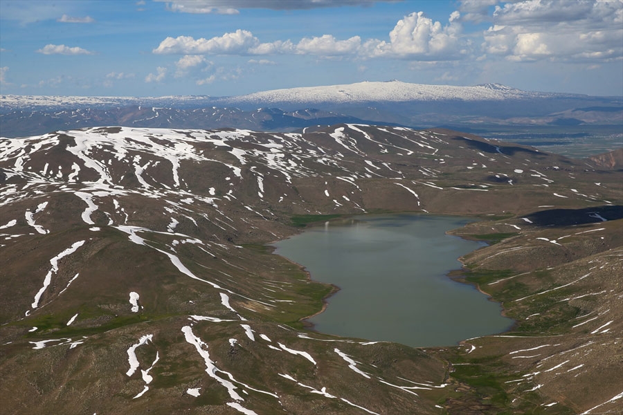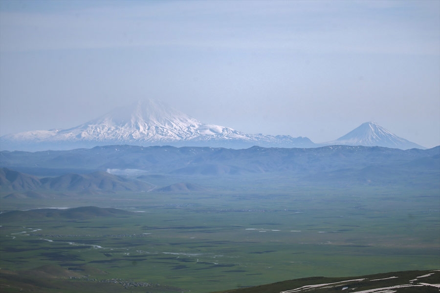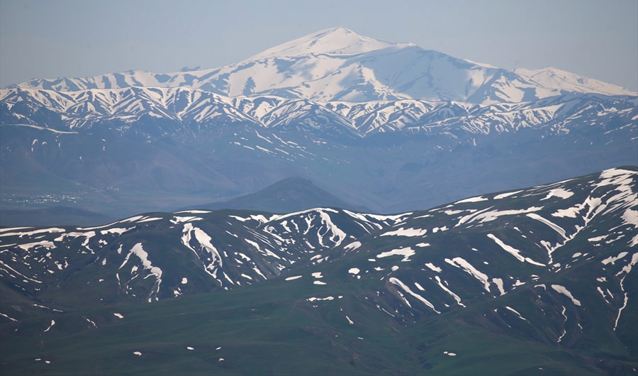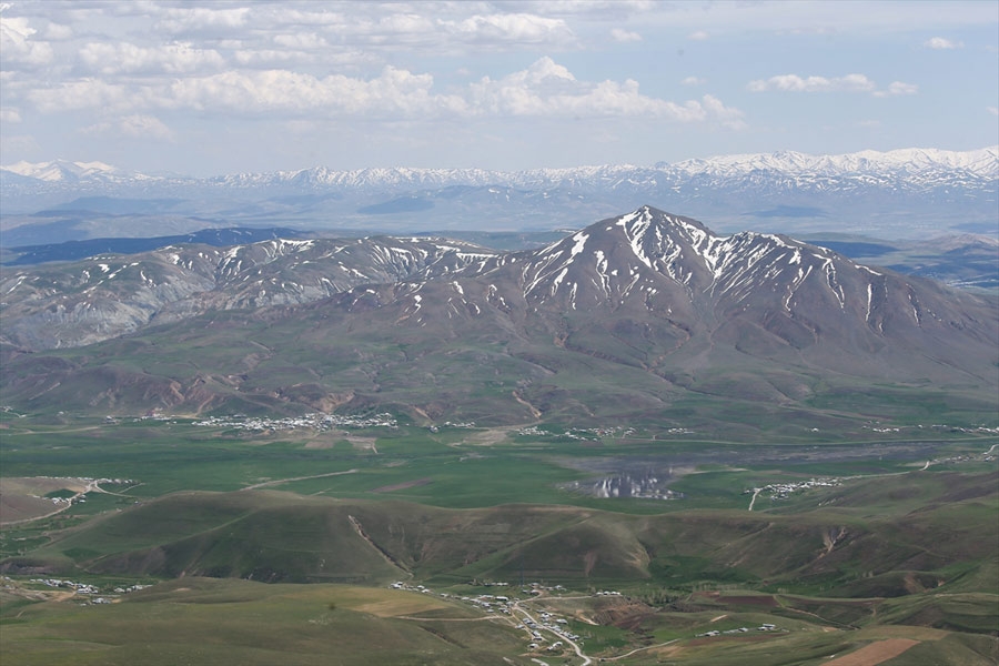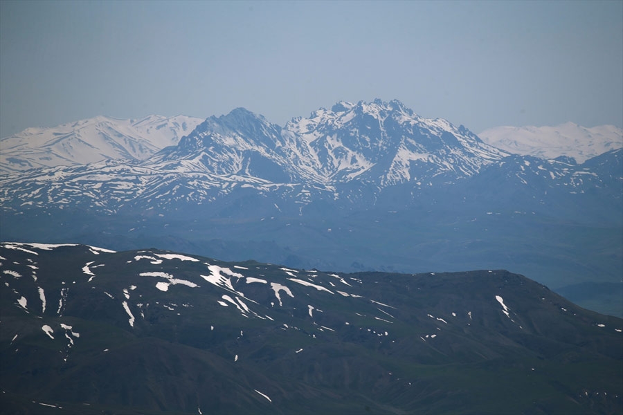Van'ın Muradiye ilçesinde bölgenin çatısı konumundaki 3 bin 100 rakımlı Pirreşit Dağının zirvesinden, çevredeki dağ ve doğal güzellikler kuş bakışı izlenebiliyor. Fotoğrafta Van Gölü ve kıyısındaki Süphan Dağı görülüyor.