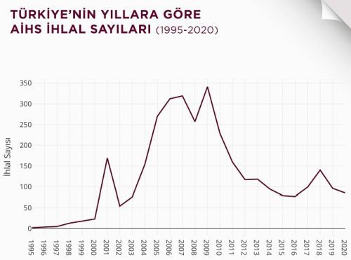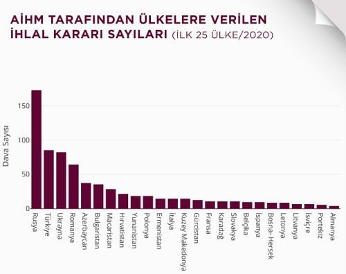 2020 yılında, Avrupa Konseyi üyesi toplam 47 ülke arasında hakkında 173 ihlal kararı verilen Rusya’nın ardından Türkiye 85 ihlal kararı ile ikinci ülke konumunda.