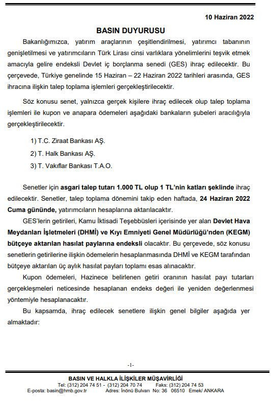 "Bakanlığımızca, yatırım araçlarının çeşitlendirilmesi, yatırımcı tabanının genişletilmesi ve yatırımcıların Türk Lirası cinsi varlıklara yönelimlerini teşvik etmek amacıyla gelire endeksli Devlet iç borçlanma senedi (GES) ihraç edilecektir. Bu çerçevede, Türkiye genelinde 15 Haziran – 22 Haziran 2022 tarihleri arasında, GES ihracına ilişkin talep toplama işlemleri gerçekleştirilecektir.