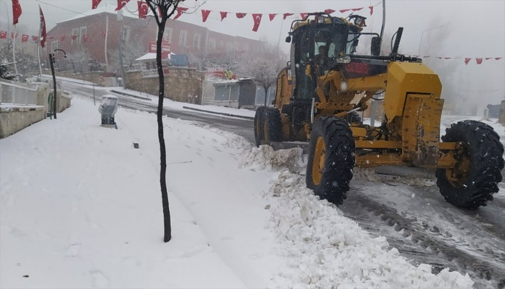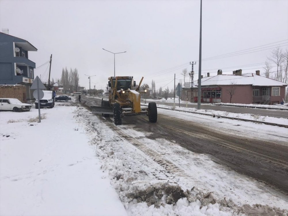 Van'ın Başkale ilçesinde etkili olan kar nedeniyle ilçe merkezi beyaza büründü, belediye ekipleri kar küreme çalışması yaptı.