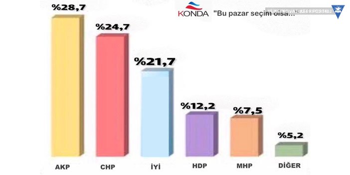 Yanıtlarda Ak Parti yüzde 28,7 ile birinci sırayı alırken, MHP yüzde 7,5 ile sona yerleşti. İYİ Parti'nin yüzde 21,7 ile tırmanışını sürdürdüğü, HDP'nin bütün baskı, saldırı, yasaklama ve sansüre karşın yüzde 12,2 ile yerini koruduğu, CHP'nin ise yüzde 24,7 ile ikinci sıraya yerleştiği, diğer partiler toplamının ise yüzde 5,2'lik bir dilimi kapsadığı görüldü.