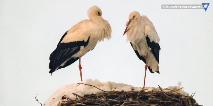 Hakkari'nin Yüksekova ilçesinde göç etmeyen ve dondurucu soğukta elektrik direğindeki yuvalarında yaşamayı sürdüren iki leylek, köylülerin maskotu oldu.