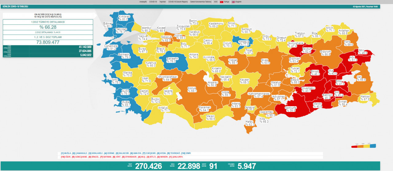 Sağlık Bakanlığı, korona virüsü salgınına ilişkin günlük resmi verileri açıkladı. Buna göre son 24 saate 22 bin 898 kişinin testi pozitif çıktı, 91 kişi vefat etti, iyileşen kişi sayısı 5 bin 947 oldu.