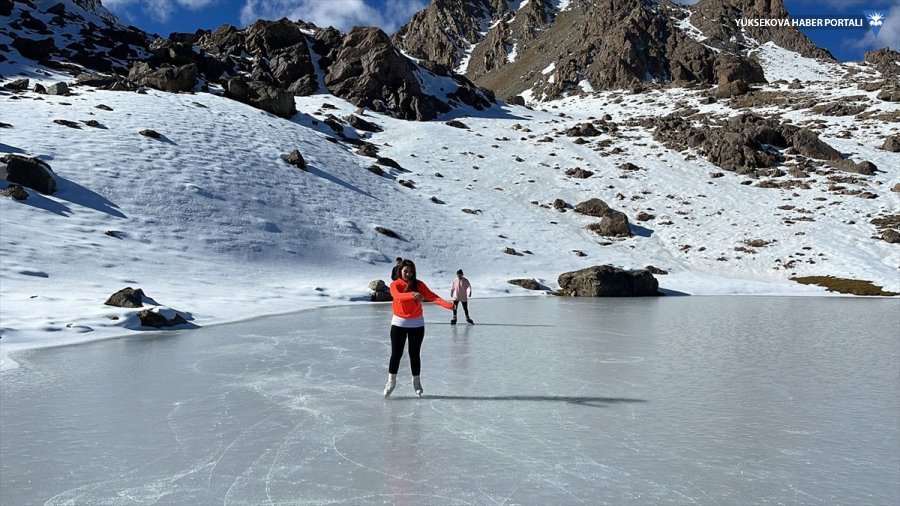 Hakkari'de fotoğraf sanatçısı ile buz pateni antrenörleri, soğuk hava nedeniyle donan Seyithan Gölü'nde dans ederek buz pateni yaptı.