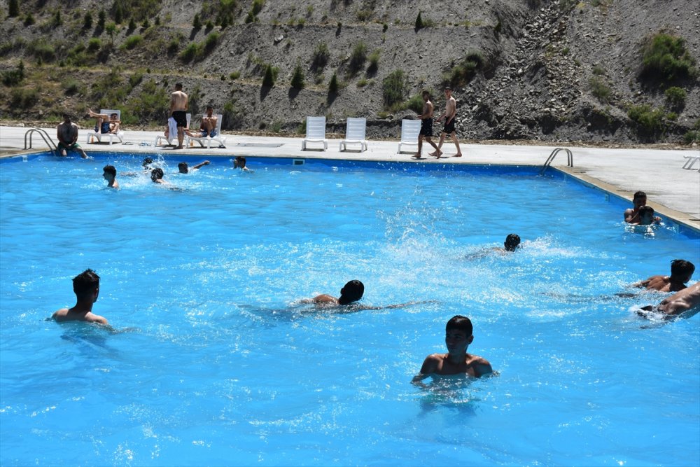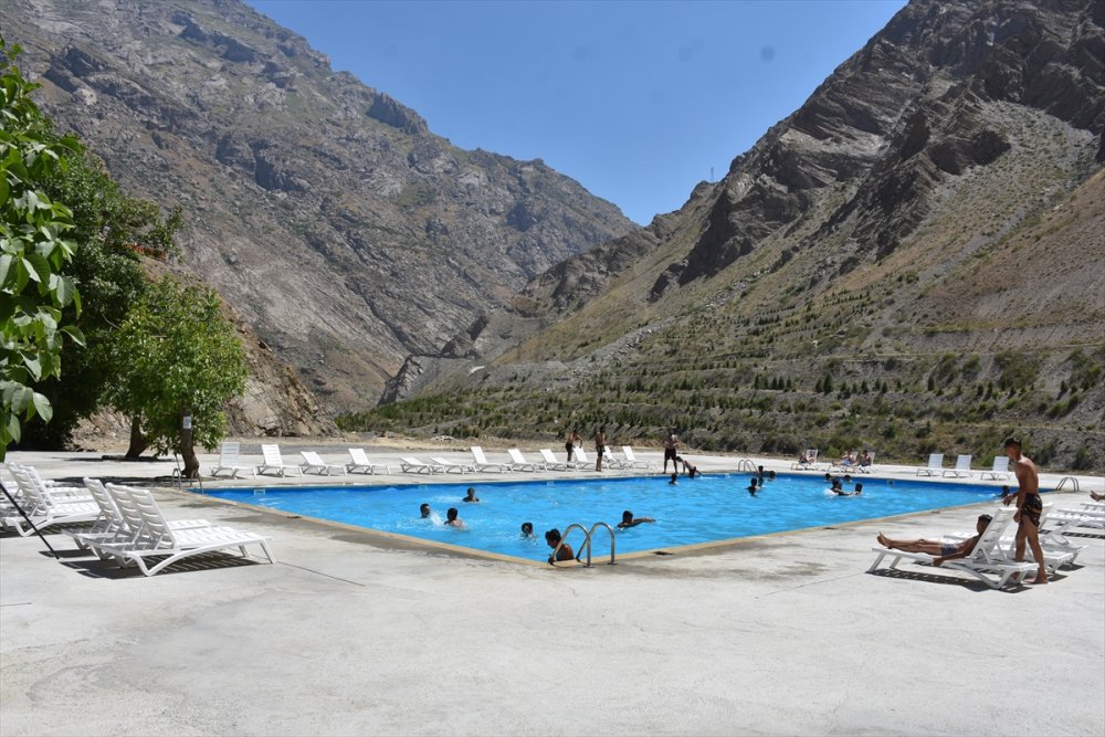 Hakkari'de vatandaşlar, Sümbül Dağı eteklerinde kurulan yarı olimpik havuzda serinlemenin keyfini yaşıyor.