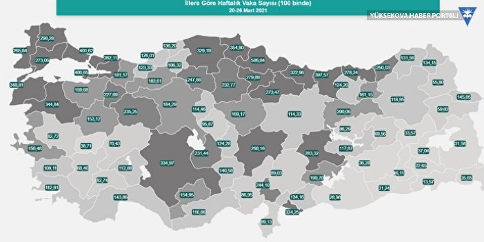İllerin her 100 bin kişide haftalık (20-26 Mart) Kovid-19 vaka sayısı şöyle: