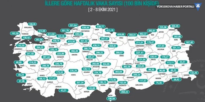 Sağlık Bakanı Fahrettin Koca, 2 ve 8 Ekim tarihlerini içeren illere göre haftalık vaka sayısını açıkladı. Koca paylaşımında, "2-8 Ekim arasında, 100 bin kişi içinde bir haftalık toplam yeni Covid-19 vaka sayısı il bazında neydi? Yaşadığınız, gidip geldiğiniz ildeki durumu haftalık İnsidans haritamızdan öğrenebilirsiniz" ifadelerini kullandı.