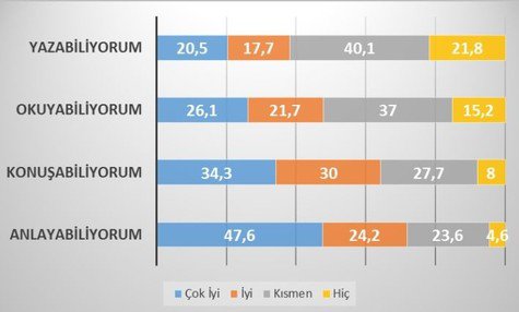 Anadilini "çok iyi" düzeyde okuyabildiğini belirtenlerin oranı yüzde 26,1'i oluştururken, "iyi düzeyde okuyabildiğini" belirtenlerin oranı ise yüzde 21,7'de kaldı. Katılımcılardan anadili ile yazanların oranı yüzde 20,5, iyi düzeyde yazabildiğini belirtenlerin oranı ise yüzde 17,7'de kaldı.
