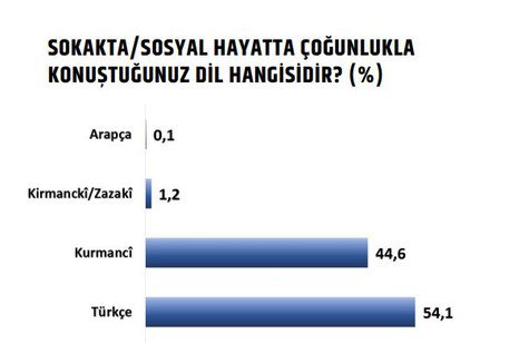 Araştırmaya katılanların yüzde 89,4'ü anadilinin Kurmancî, yüzde 10,1'i Kirmanckî/Zazakî, yüzde 0,5'i ise hem Kurmancî hem de Kirmanckî/Zazakî olduğunu söyledi.