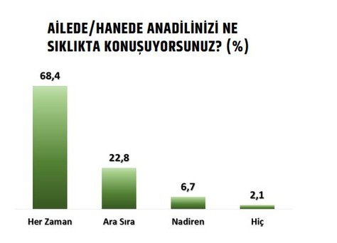 Görüşmecilerin yüzde 68,4’ü hane içinde/aile de anadilini “her zaman” kullandığını, yüzde 22,8’i “ara sıra” yüzde 6,7’si “nadiren” konuştuğunu yüzde 2,1’i “hiç konuşmadığını” belirtti.