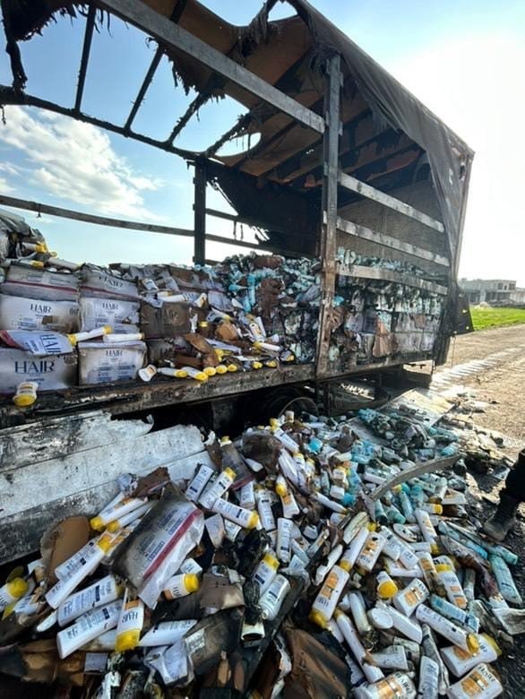 Mardin'in Kızıltepe ilçesinde seyir halindeki şampuan yüklü tır alev alarak yandı.