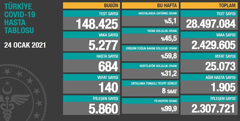 Sağlık Bakanlığı, 24 Ocak koronavirüs verilerinin yer aldığı tabloyu paylaştı.