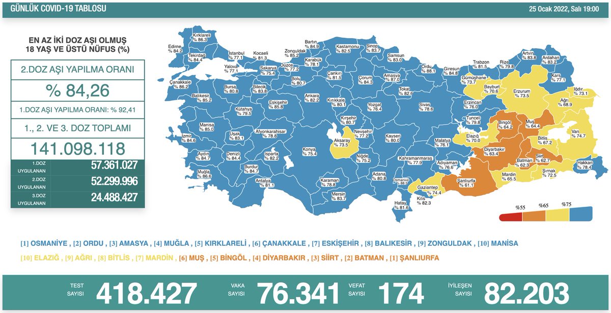 18 yaş ve üstü nüfusta en az iki doz aşı yaptıranların oranının en yüksek olduğu 10 il Osmaniye, Ordu, Amasya, Muğla, Kırklareli, Çanakkale, Eskişehir, Balıkesir, Zonguldak ve Manisa oldu.