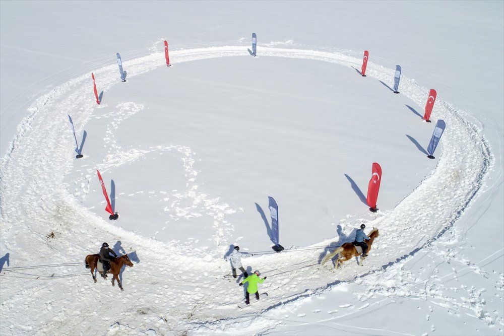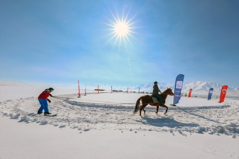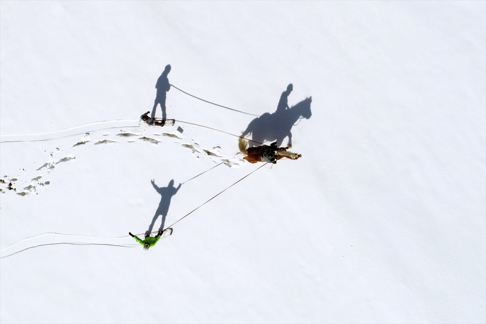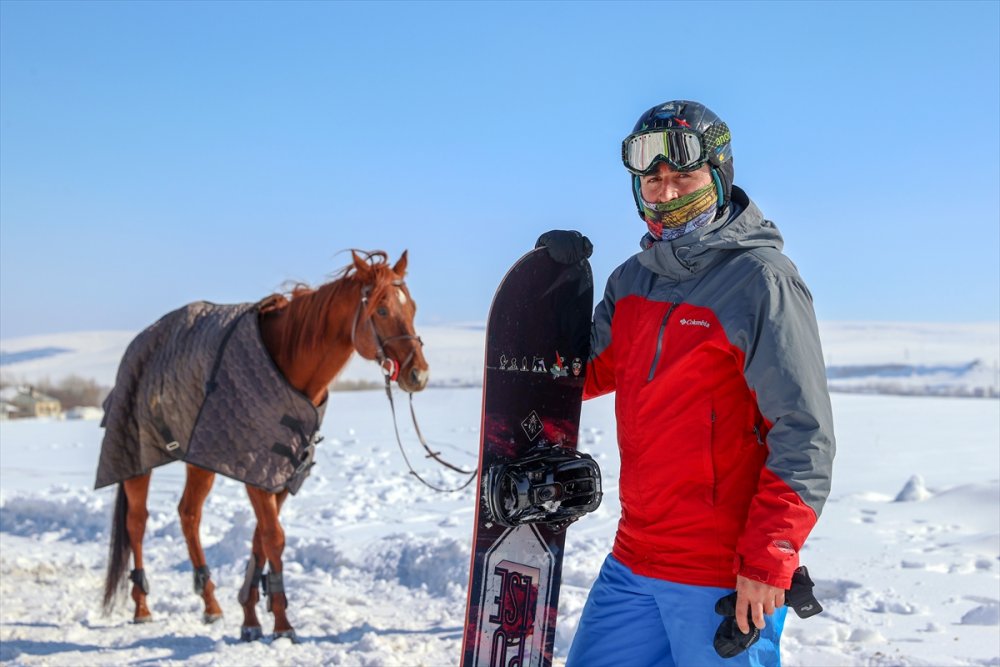 Van'ın Edremit ilçesinde kayakçılar, Olimpik Binicilik Merkezi'nde atlara bağladıkları iplerle karda snowboard yaptı.
