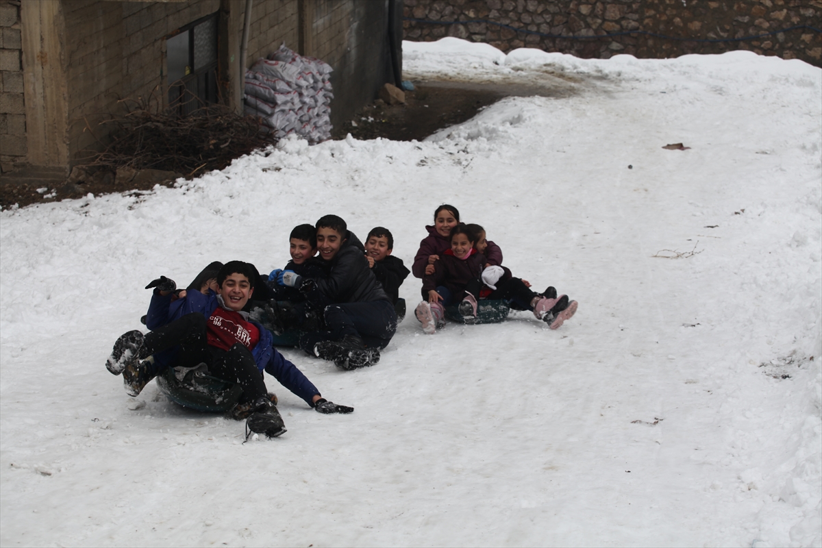 Ahmet Uysal da yarıyıl tatilini değerlendirdiklerini belirterek, "Evden getirdiğimiz poşet ve plastik bidonlarla kaymaya çalışıyoruz. Çok eğleniyoruz." dedi.