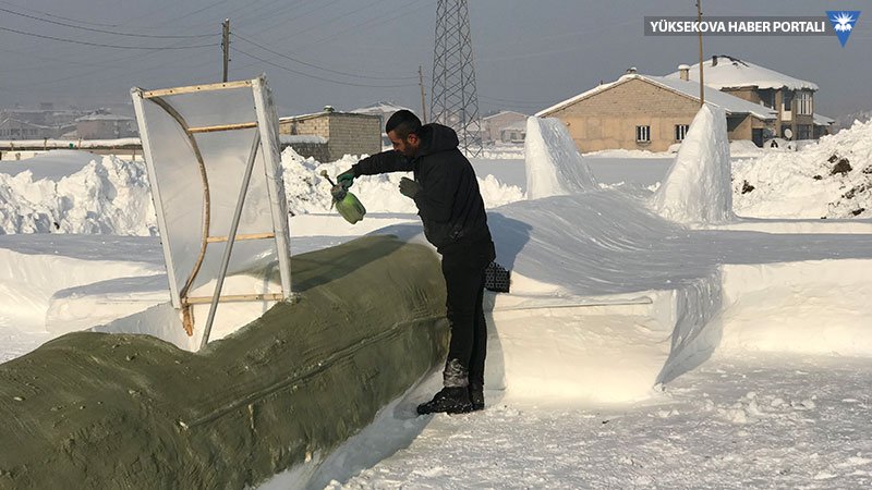 Yeni Mahalle'de yaşayan, inşaat işçiliği ve çobanlık yaparak geçimini sağladığını belirten Mehmet Şerif Karahan, evinin önünde eksi 20 dereceye varan soğuk havaya aldırmadan kardan savaş uçağı yaptı.