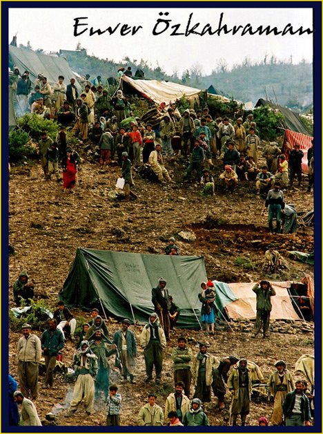5- Çukurca'da 1991'de, 3-5 gün içinde beş yüz bin insan yığılmıştı sınıra.. Bu görüntüdekilerin çoğunluğu Êzidi oldukları için biz buraya “Êzidi mahallesi” ismi takmıştık ve iki ay boyunca biz 3-4 arkadaş buradaki Êzidi ve Mesihi çocuk ve hastalara gözümüz gibi bakmış elimizden geldiğince ihtiyaçlarını karşılamıştık..