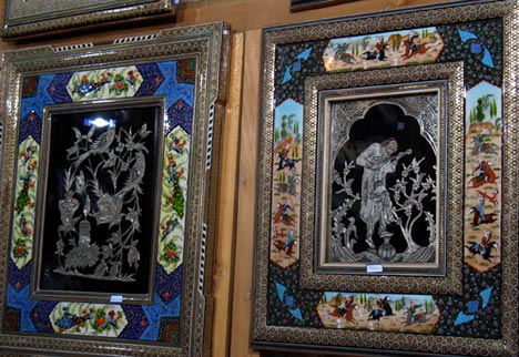 Bir vitrinde gümüş kakmalı vazolar. Hemen hemen her kentte halıcılık, kilimcilik gümüşçülük, nakkaşlık, kakmacılık, çinicilik, çömlekçilik, kalemzeni, maden üstüne resim, altın işlemeli kumaş dokumacılığı, kumaş ve beze baskı işleri bir gelenek halini almış.