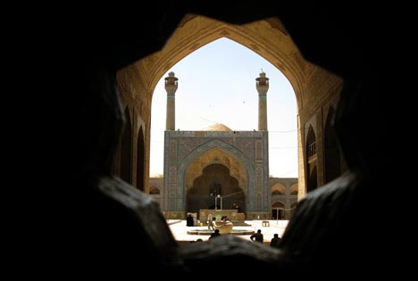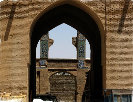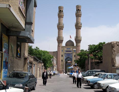 Tebriz de üç şerefeli renkli tuğlalardan oluşan iki minareli bir cami.